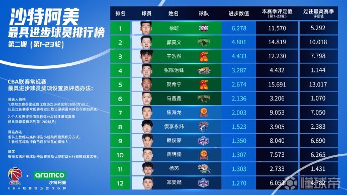 英超新闻北京时间2月7日,CBA官方公布了联赛第1-23轮最具进步球员排名,广州队球员徐昕继续排名第一位。