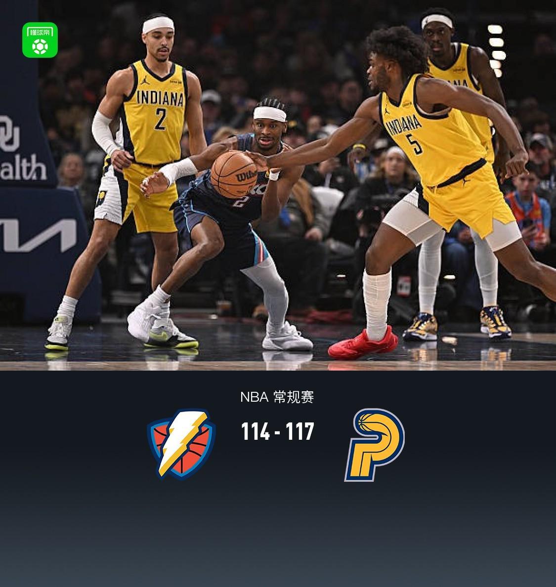 步行者客场117-114送雷霆赛季第9败,亚历山大空砍47分