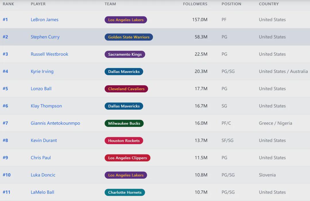 国王队为了输球,有时候收官阶段故意换下威少和德罗赞。今天国王是真想赢球了,决胜阶段依然把他俩留在场上。近日有媒体盘点了足球、篮球和橄榄球的球星Ins粉丝数,威少2250万粉丝排名NBA第三,仅次于詹姆斯和库里。