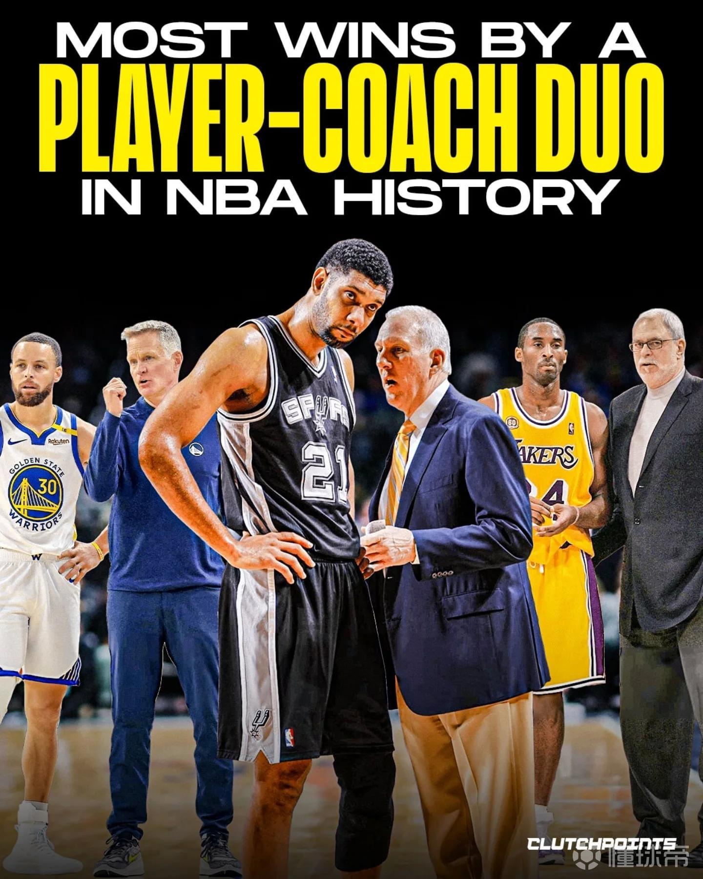 球员&教练搭档赢球场次排名:邓肯+波波1001场领衔,库里+科尔在列