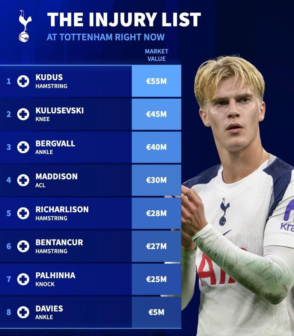 德转列热刺伤病名单:8人因伤缺阵,总身价超过2.5亿欧元