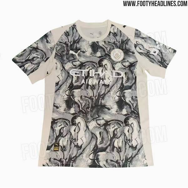 此前,知名球衣装备网站Footy Headlines曾披露过这款球衣的谍照,据悉,曼城2026年马年球衣以米色为底色,正面饰有密集的马头图案,营造出一种相当抽象的图形效果。