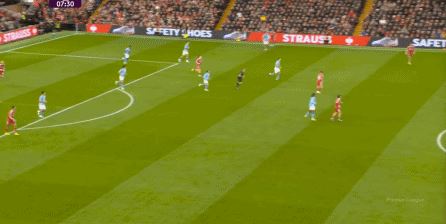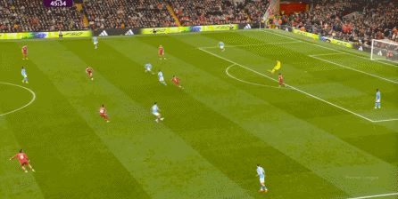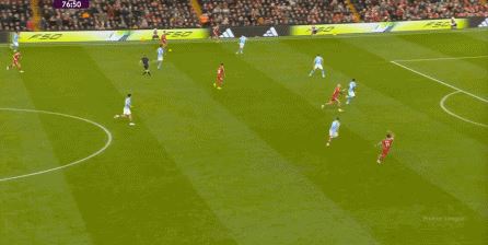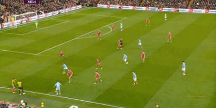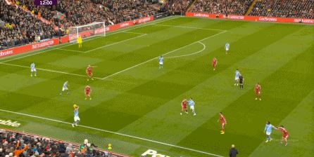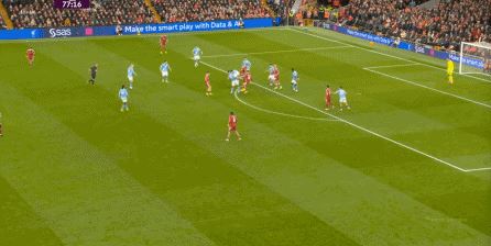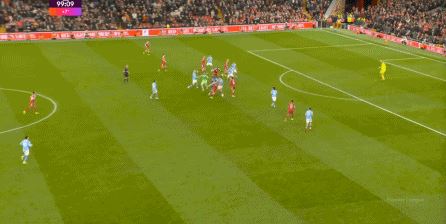 这在战术上不会有特别明显的变化,所以曼城的表现并未立刻改善,于是在第73分钟,利物浦在由左至右的转移过程中打出进攻,随后在二点争夺中制造了定位球: