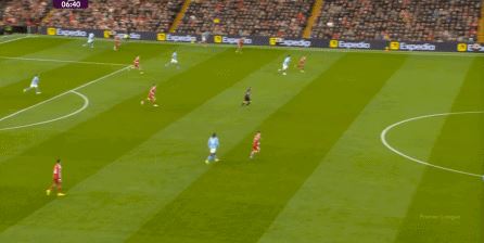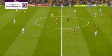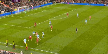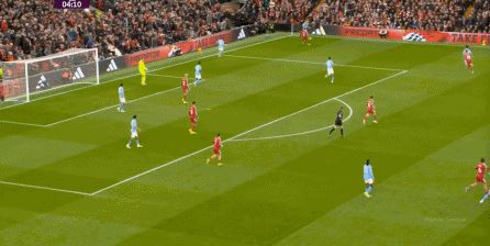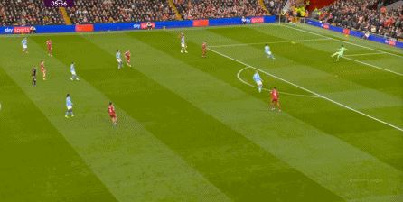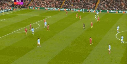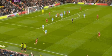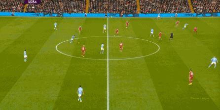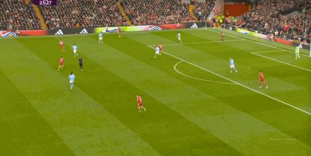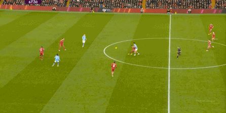当然了,利物浦的进攻威胁程度和曼城还是没法比,萨拉赫的确不负当年之勇,但埃基蒂克和维尔茨也没有什么像样的表现,所以曼城很快重新掌握大局,在第33分钟,用利物浦的失误和自身的跑位,带着维尔茨的罗德里在右路送出了传中: