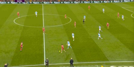 到了这个时候,有经验的教练就会有所警惕了,但利物浦还在进行高位逼抢,尽管他们可以逼迫曼城开大脚,但大脚落到前场,曼城有机会凭借前场的个人能力直接形成进攻: