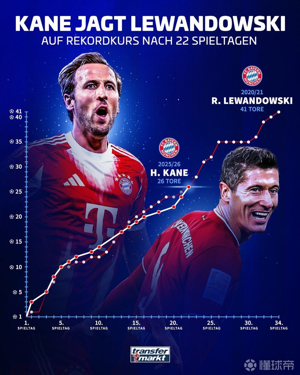 德转对比凯恩与莱万纪录赛季的进球走势,他会打破纪录吗?