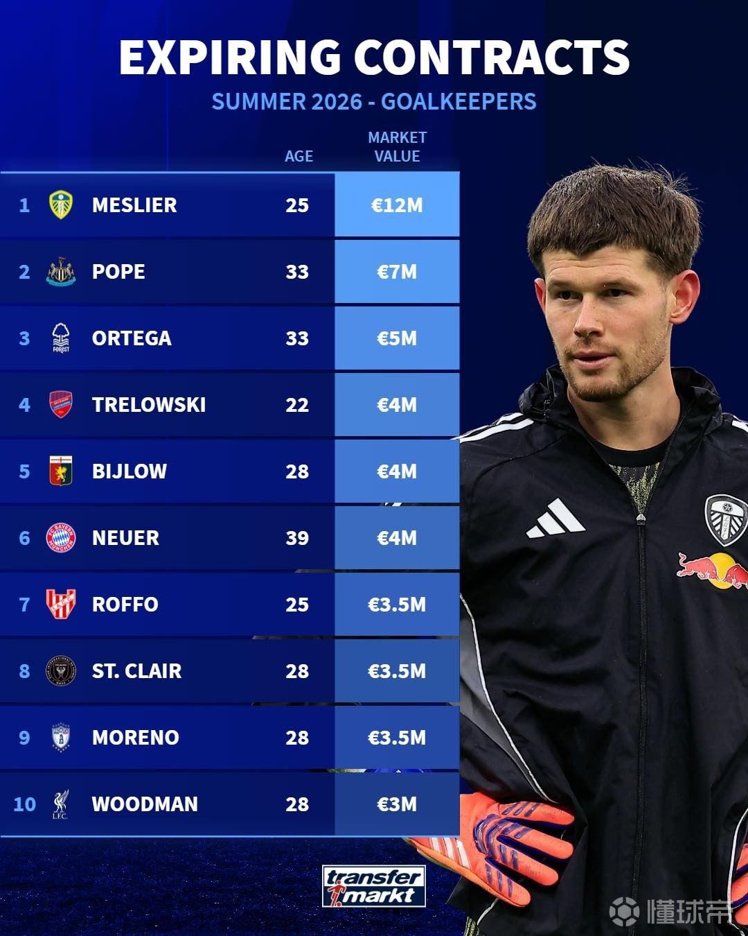 英超新闻德国转会市场统计了今夏合同到期的十大门将,其中球员按照身价从高到低排序。