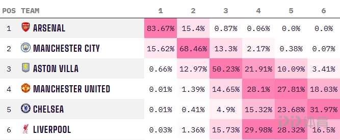 切尔西目前的前五概率为44.32%,利物浦的前五概率为75.42%。虽然利物浦目前暂居第6,但仍被相对看好。
