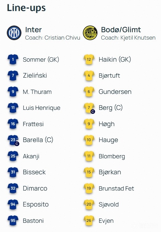 替补:12-迪詹纳罗、13-何塞普-马丁内斯、2-邓弗里斯、6-德弗赖、8-苏契奇、14-博尼、15-阿切尔比、17-迪乌夫、22-姆希塔良、30-卡洛斯-奥古斯托、36-达米安、47-拉韦利