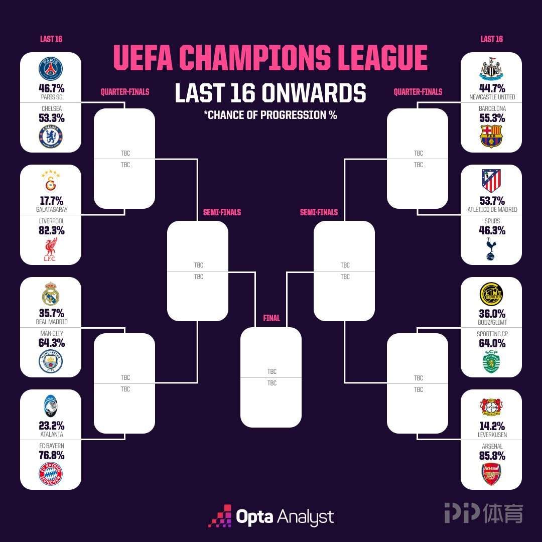 英超新闻OPTA超算对欧冠1/8决赛进行了10000次模拟,各组对阵晋级概率如下。