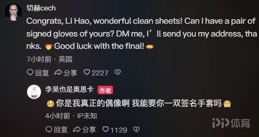 切赫今日现身李昊社媒评论区写道:“祝贺你李昊,精彩的零封!可以给我一双你的签名手套吗?私聊我,我会给你我的地址,谢谢,决赛好运!”