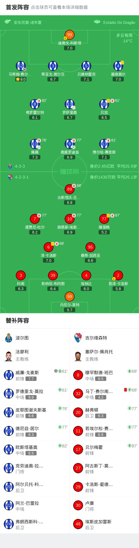 波尔图3-0大胜吉尔维森特,威廉-戈麦斯破门,马蒂姆-费尔南德斯建功