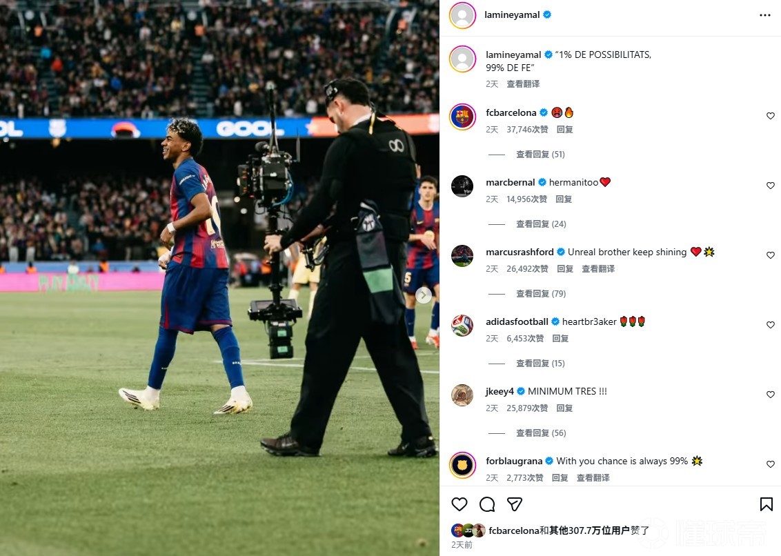 亚马尔也复制了这一信息,并用加泰罗尼亚语发布:“1% de possibilitats, 99% de fe”(1%的可能性,99%的信念)。