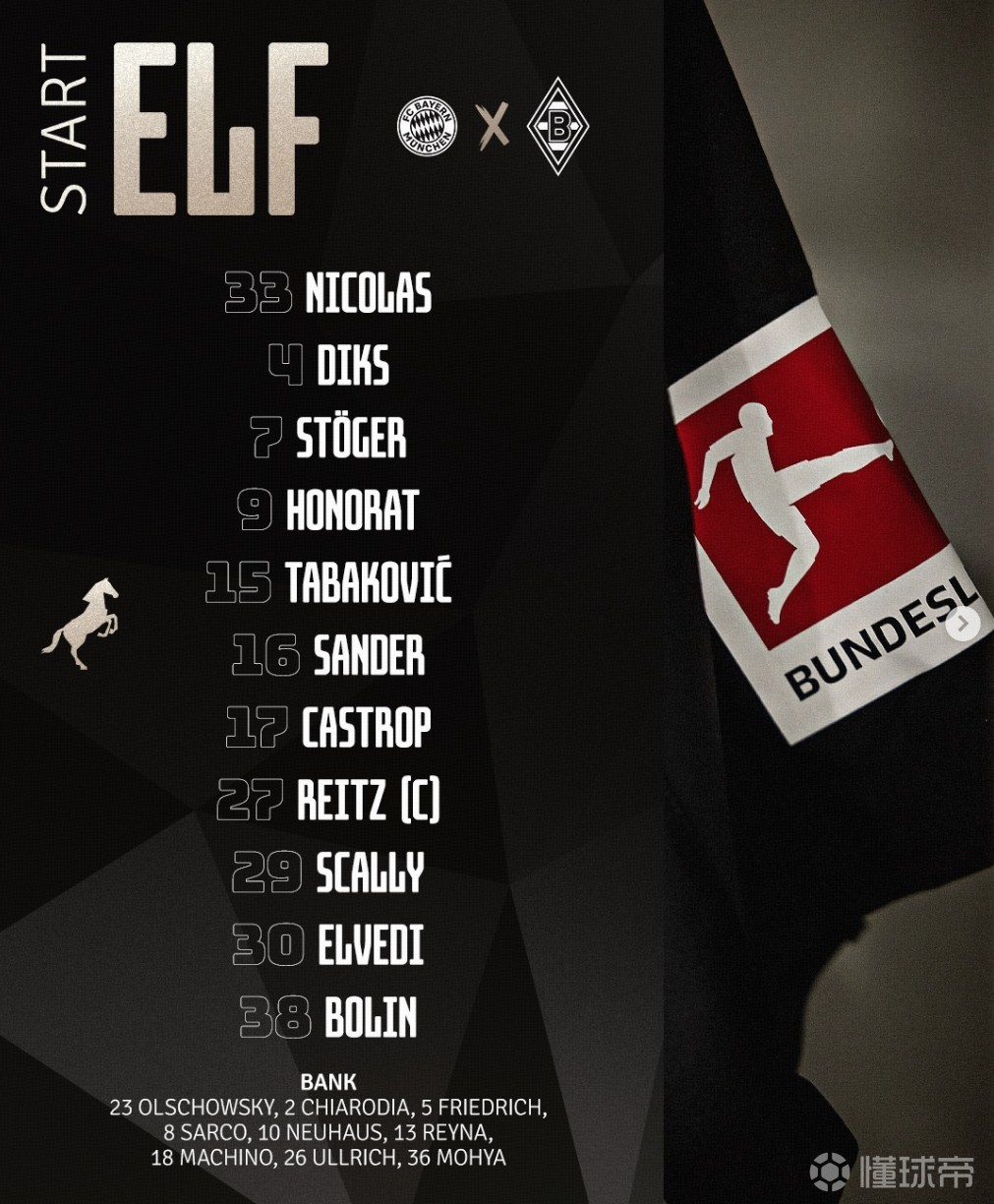 门兴格拉德巴赫:33-莫里茨-尼古拉斯、4-凯文-迪克斯、30-尼科-埃尔维迪、16-桑德尔、17-卡斯特罗普、7-凯文-施特格尔、27-赖茨、29-约瑟夫-斯卡利、38-胡戈-博林、9-奥诺拉、15-哈里斯-塔巴科维奇
