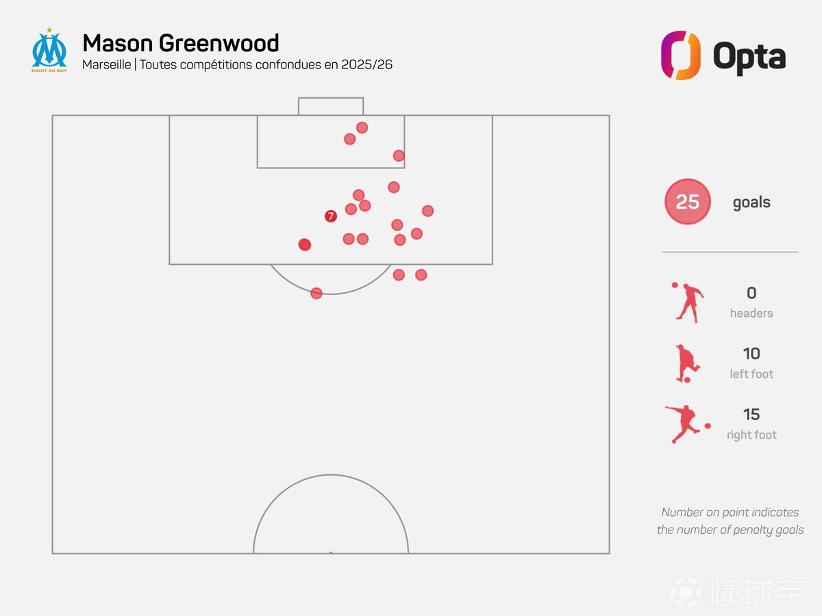 至此,格林伍德本赛季各项赛事已打入25球,其中10球来自左脚,另外15球来自右脚。