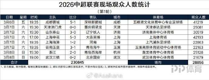 英超新闻德转管理员朱艺统计2026中超联赛第一轮现场观众人数,以下是具体信息。