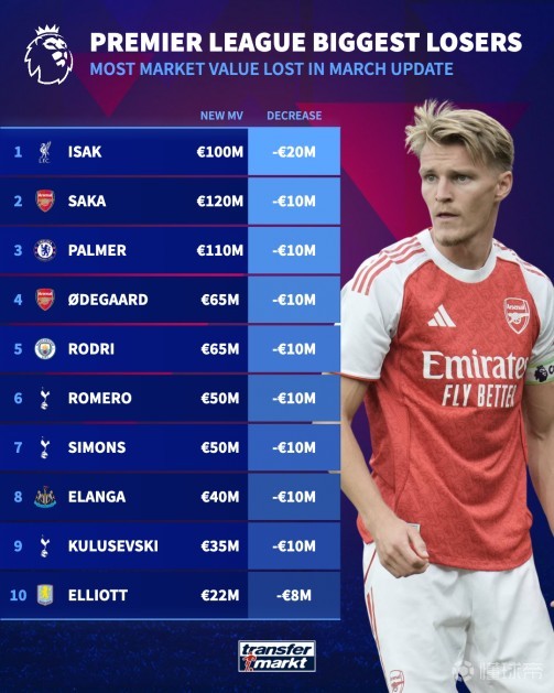 英超新闻北京时间3月9日,德转更新英超身价。其中伊萨克下跌2000万欧来到1亿欧元,萨卡、帕尔默、厄德高、罗德里各下跌1000万欧。