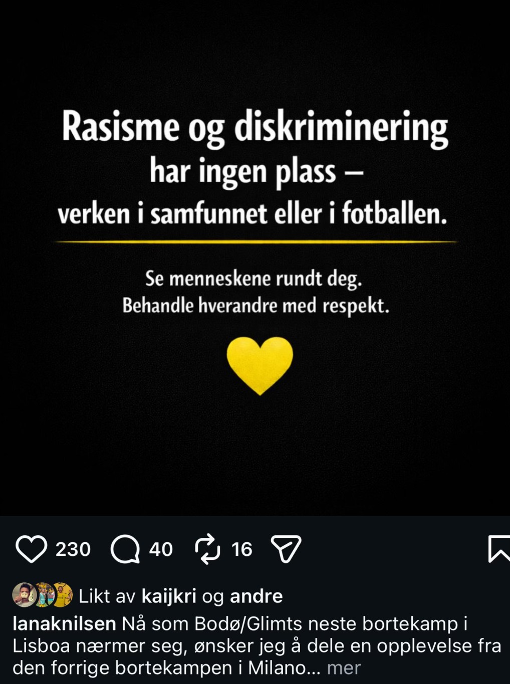 俱乐部方面也公开表态支持拉娜。俱乐部新闻负责人西门-佩德森(Simen Pedersen)在发给NRK的短信中表示:“我们对这种行为表示强烈反对,这种行为在博德闪耀大家庭中或社会上都不受欢迎。听到拉娜在米兰遭遇这样的事情,我们感到很遗憾,并全力支持她。我们与拉娜一起反对种族歧视。”