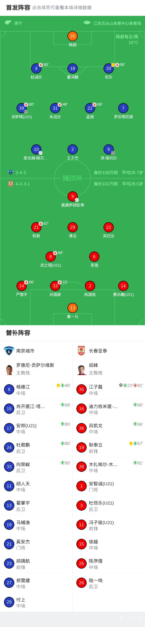 北京时间3月15日中国足球甲级联赛 联赛 第1轮,南京城市主场对阵长春亚泰。上半场,江子磊破门打破场上平衡。补时阶段,泽-维托尔破门将比分扳平。下半场,余梦辉破门将比分反超,随后双方再无建树。最终,南京城市2-1逆转长春亚泰迎来开门红。